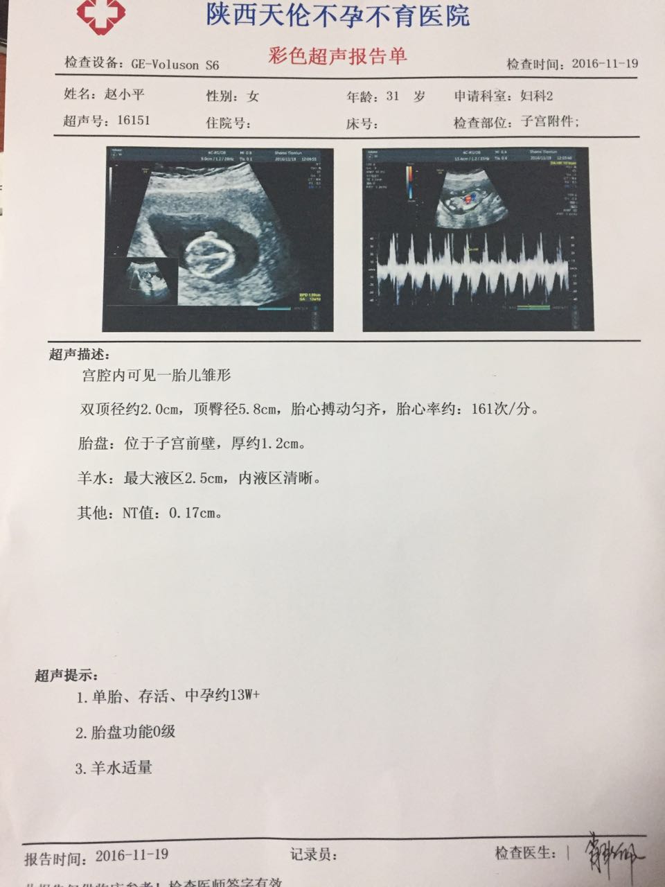 患者自述:自从二胎政策下来后,我就和丈夫积备孕二胎,但一直都没有动静,家里人也跟着着急。在西安转折几家医院也看了好久,都没有怀上。后来经朋友介绍,来到陕西天伦不孕不育医院,当时接诊我们的是袁晓岚袁主任,在详细了解我的病史、通过专业系统的检查,确诊我为输卵管梗阻且伴有多囊卵巢综合征不孕症。后来,在2016年3月18日行宫腹腔镜联合微创术,术后住院三天就出院了,4、5月到院复查恢复很好,7月初进行促排卵,没想到8月份就怀孕了,当时真的特别惊讶,真的没想到这么快就能怀上二胎,赶紧给袁主任打电话报喜。