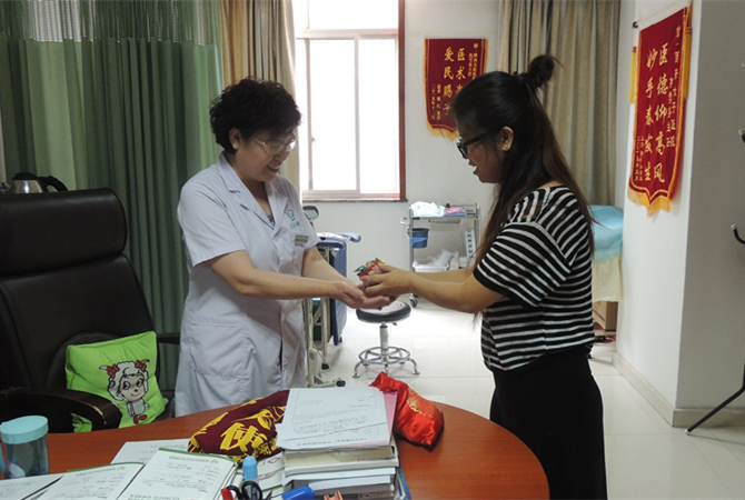 2016年8月27日张险在老公的陪同下来我院报喜,送锦旗感谢焦院长精湛的医术,并给大家发喜糖,分享她的幸福。