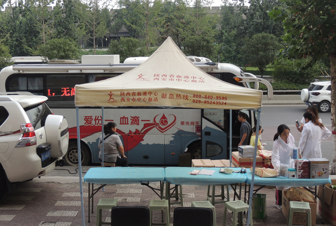 8月31日早晨八点半西安市中心血站的无偿献血车停在医院门口,工作人员有条不紊的开始摆放桌椅、献血所需的医疗器械及准备的爱心早餐。我院医护人员在血站工作人员的指导下填表、检测、采血,按要求秩序井然地进行着。